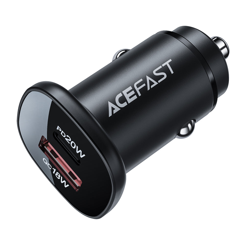 Acefast fast car charger. It has 2 ports, USB Type C and USB. The first USB Type C plug allows you to charge with a maximum power of 20W, and a USB plug up to 18W. Allows for quick charging, among others in PPS, Power Delivery, Quick Charge 3.0, AFC and FCP standards. 2 devices can be connected to it at the same time. It is made of fireproof PC material. It has been equipped with many protections, such as overheating, overvoltage, high voltage or overload.