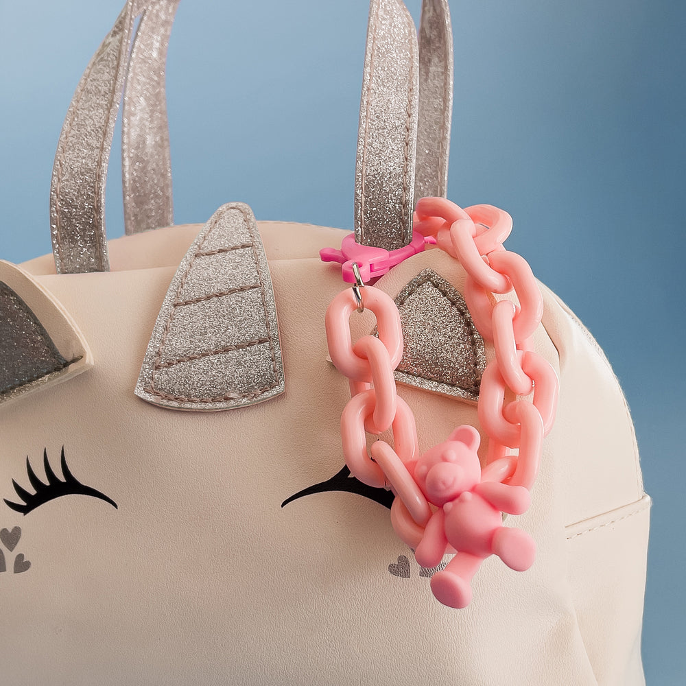 An original, fun accessory that will change your smartphone, purse, backpack and much more. A colorful chain with a teddy bear figurine, all made of lightweight plastic.
