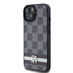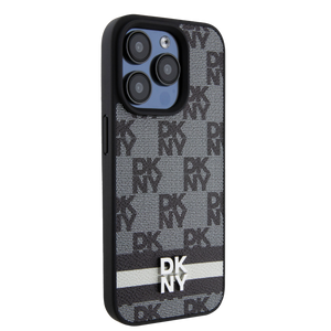 DKNY Leather Checkered Mono Pattern & Printed Stripes Case for iPhone 15/14/13 - Black