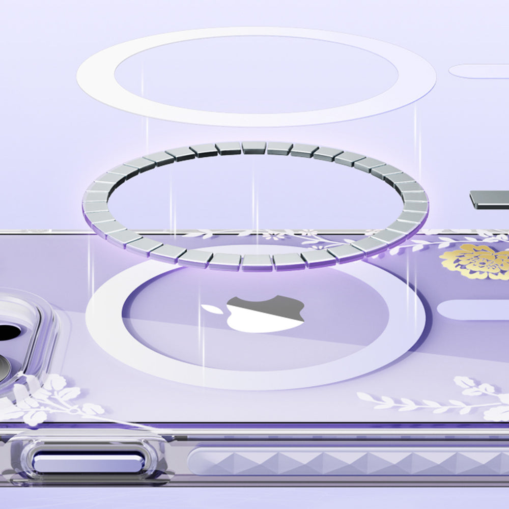 Magnetic iPhone 14 Plus MagSafe case from the Kingxbar Flora series in orchid color
