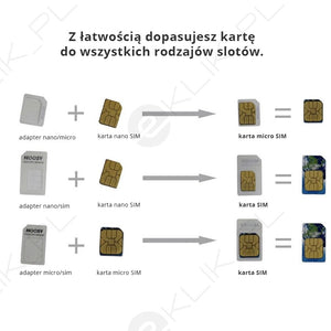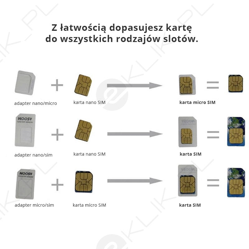 The Noosa adapter set is a practical and reliable tool that allows you to quickly adapt your SIM card to any device. With it, you can easily transform your nano SIM card into a micro SIM or standard SIM, and your micro SIM into a classic SIM – exactly when you need it. The set also includes a solid, metal key for removing the SIM tray, which will prevent damage to your phone and the card itself. This is a universal solution that gives you the flexibility to use one card in all devices, regardless of their age or design. The adapters are characterized by high quality and durability, and the entire set is in the original manufacturer's packaging. Save time and money – with Noosa, changing your SIM card becomes quick, easy and safe.