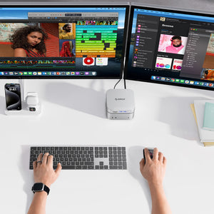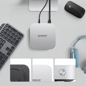 The Orico MiniLink 9-in-1 Docking Station is a powerful expansion center designed for the 2024 Mac mini and modern computers with a USB-C port. It combines a docking station with an M.2 SSD enclosure, allowing for increased ports and data storage. Its aluminum casing, active cooling, and well-thought-out port layout make the MiniLink ideal for office work, creative work, and handling large multimedia files.