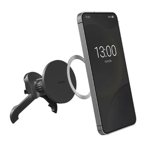 The Puro car holder with the magnetic MagSafe system is a reliable solution for drivers who value comfort, stability and safety while driving. Thanks to its solid construction based on a three-point mounting system, the holder holds stably to the air vent, even on uneven surfaces. The adjustable mount adapts to different types of air vents, and the 360° rotation system allows you to set your smartphone in any position - vertically or horizontally, which ensures perfect visibility of the screen when using navigation or making hands-free calls. Compatibility with MagSafe means instant and secure attachment of iPhones with appropriate cases, but the holder is also universal - thanks to the included metal ring, it also works with phones without MagSafe. The additional cable management system will take care of order in your car, eliminating tangled cables. It is a functional and stylish addition to any car.