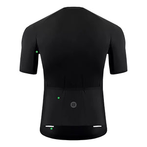 Men wearing Rockbros 15120002005 short-sleeved cycling jerseys, standing back to back, and front to back, showing off the jersey's reflective elements.