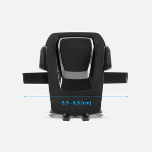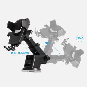 Universal car phone holder with long, telescopic arm that extends from 11,8 to 16,5 cm. Made of high-quality materials (PC + silicon) mount could be attached either to dashboard or windshield. Designed for smartphones with 5,5 to 8,5 cm width. Also, the accessory has one touch mounting system that locks and releases the device with just a push of a finger. Fully adjustable with 360 rotation allows you set it at perfect viewing position so it will not block your sight while driving.