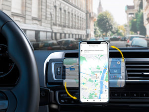The Wozinsky WMH-03 magnetic mount is secured to the air vent using a flexible clip . The clip's jaws firmly grip the air vent slats, ensuring a secure and stable hold . They are rubber-coated to prevent scratching the air vent components. The accessory holds firmly in place even on bumpy roads.