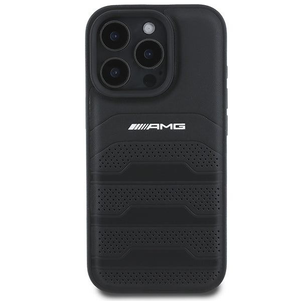 AMG odinis iPhone 16 Pro Max dėklas su įspaustomis linijomis ir juodu logotipu – juodas