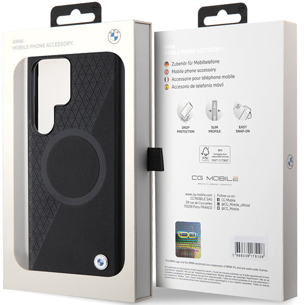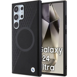 BMW BMHMS24M23RTPK S24+ S926 juodas/juodas kietas dėklas, firminis odinis pusiau tekstūruotas ir apvalus „MagSafe“ dėklas