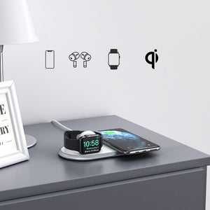 Puikus pasirinkimas funkcionalumo mėgėjams. Įkrovimo stotelė belaidžiu būdu įkrauna jūsų išmanųjį telefoną arba „AirPods“ ausines ir „Apple Watch“ – vienu ypu . Pamirškite susivėlusius laidus ir ilgą laukimą, kol akumuliatoriaus indikatorius pasieks 100 %. Rinkinyje yra įkroviklis ir adapteris su integruotu greitojo įkrovimo standartu , kuris žymiai sutrumpins su šiuo standartu suderinamo telefono įkrovimo laiką . Puiki dovana „Apple“ mėgėjams!