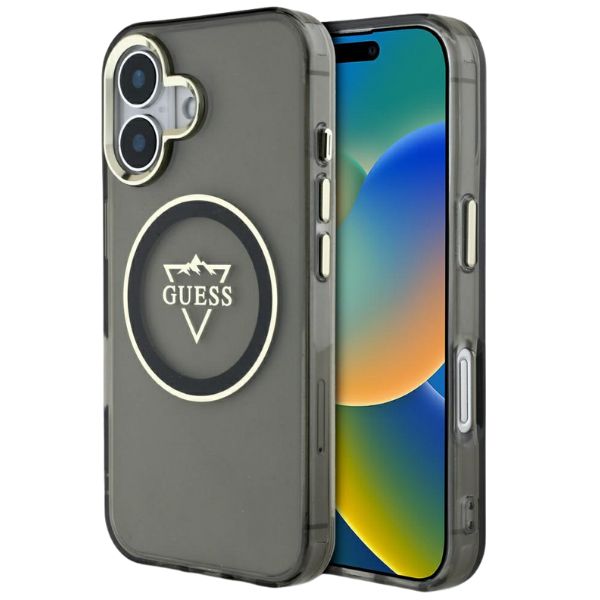 „Guess IML Metal Mountain Logo MagSafe“ dėklas, skirtas „iPhone 16“ – juodas