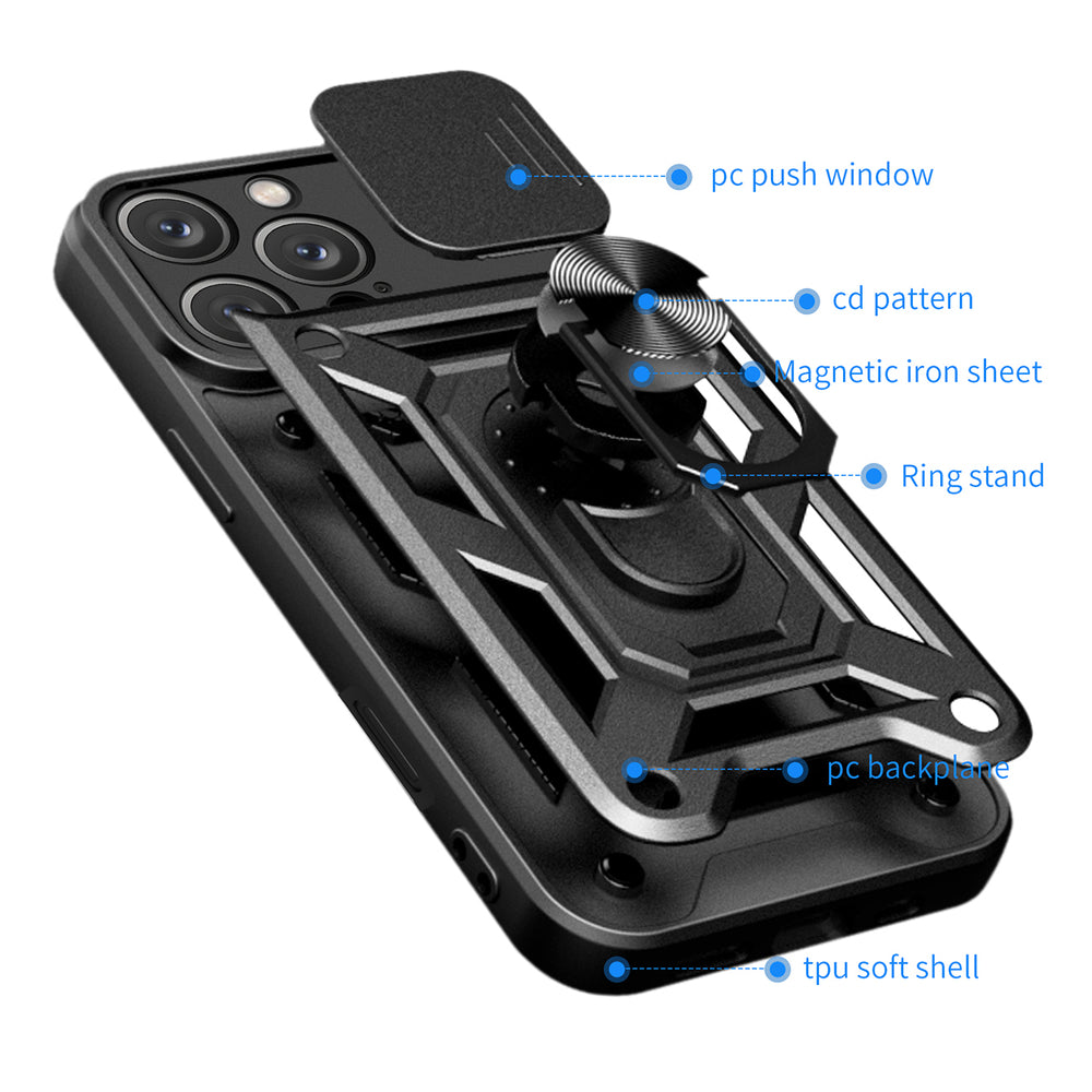 Hybrid Armor Camshield iPhone 16 Pro Case with Camera Cover and Stand - Black