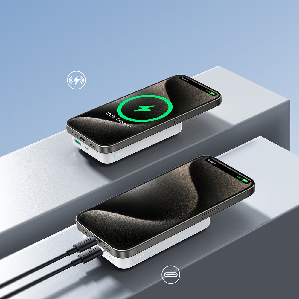 „Joyroom JR-W020“ išorinė baterija, 20 W, 10000 mAh, „MagSafe“ + USB-C – USB-C laidas, 0,25 m, balta