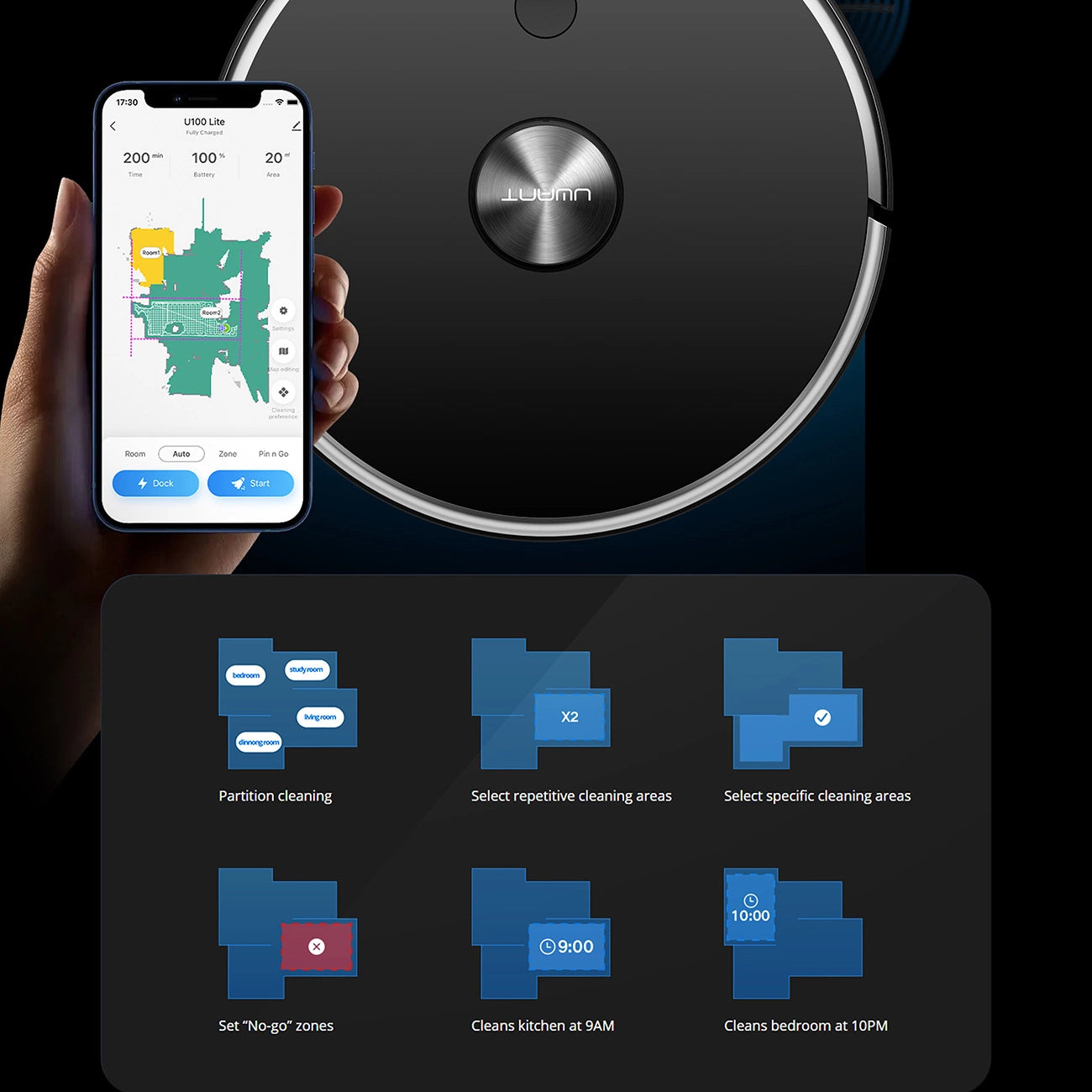 • Connection with the UWANT HOME app: With the app, you can conveniently and remotely manage your cleaning by setting schedules, planning zone cleaning, or setting no-mop zones, e.g. on carpets.