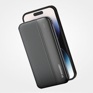 The Wozinsky WBPPK1 power bank features powerful built-in LEDs. These LEDs let you know your device's battery level at any time. So you don't have to worry about a sudden power outage . The battery charge level is displayed in standby mode by pressing the "power" button. You can easily take the Wozinsky power bank with you on any trip. Speaking of travel, the Wozinsky WPBBK1 boasts a slim design and low weight . Weighing 215 grams, it's easy to carry in a purse, backpack, or belt pouch.